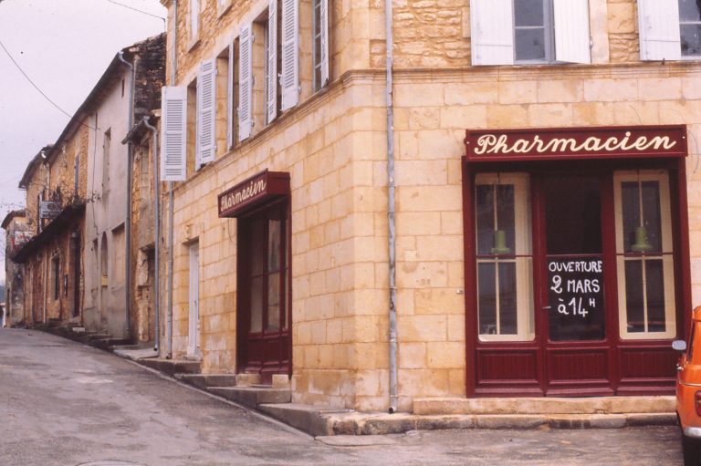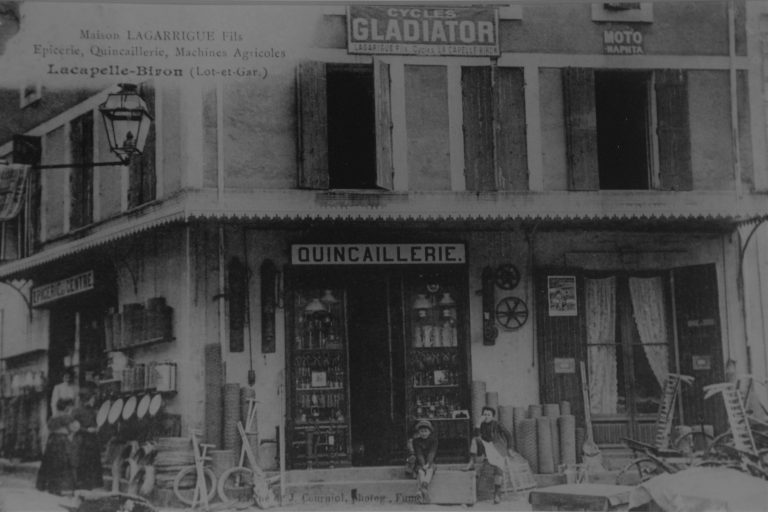 Mais avant d’être une pharmacie, le bâtiment abritait une épicerie – quincaillerie tenue par la famille Lagarrigue comme le montre cette carte postale des années 1920.