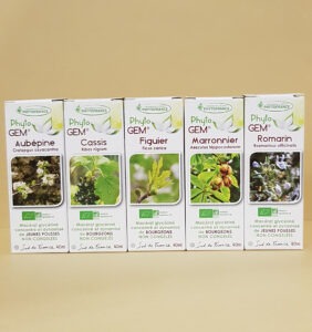 - Phyto’Gem Bio : ce sont des macérats glycérinés de bourgeons, de jeunes pousses ou de radicelles.